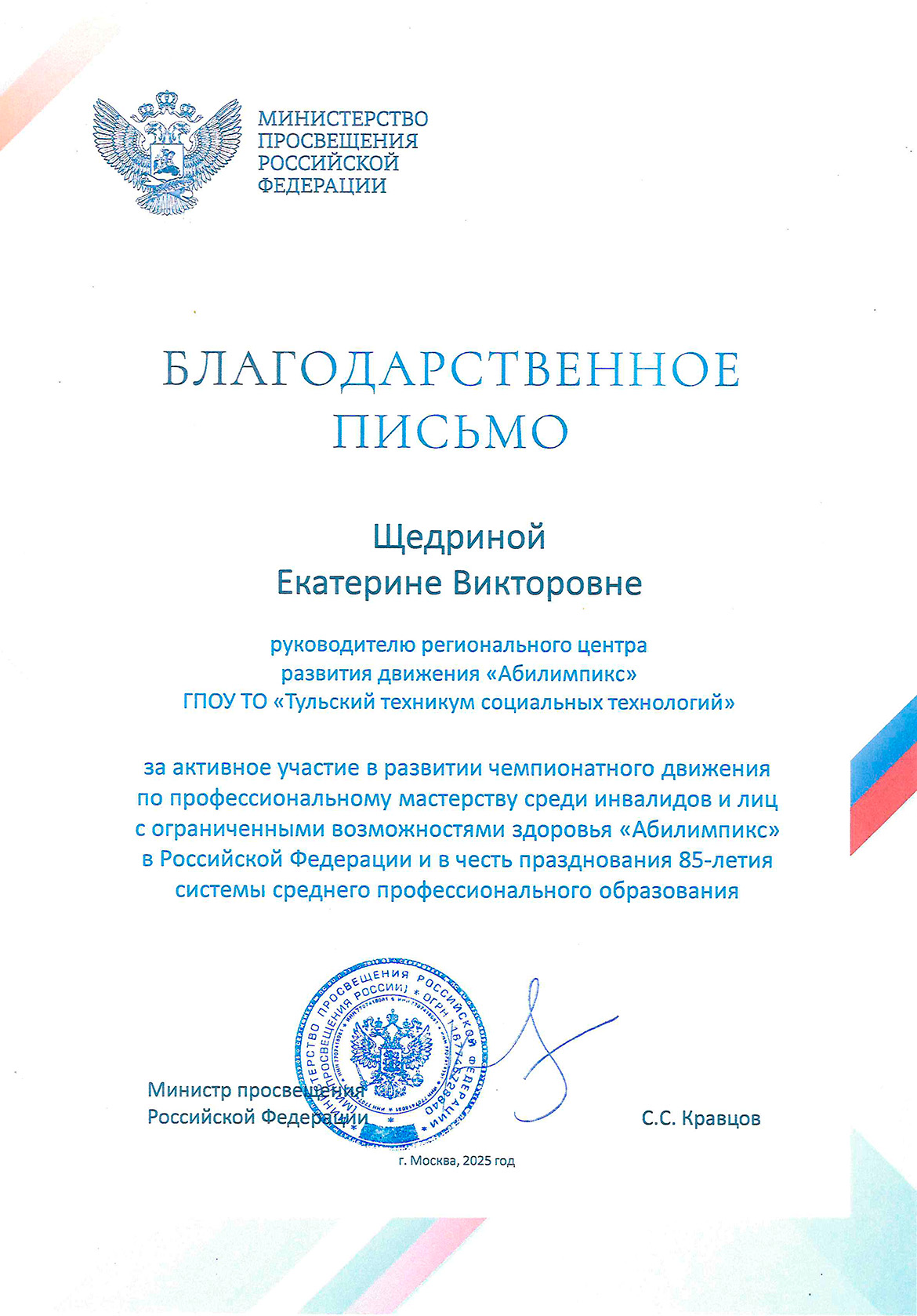 - 2024 – Почетная грамота министерства образования Тульской области от 19 августа 2024 года № 135-л