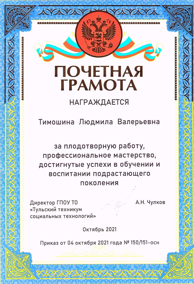 - 2021 год – Почетная грамота ГПОУ ТО «Тульский техникум социальных технологий» з а плодотворную работу, профессиональное мастерство, достигнутые успехи в обучении и воспитании подрастающего поколения (приказ №150/151-осн. от 04.10.2021)