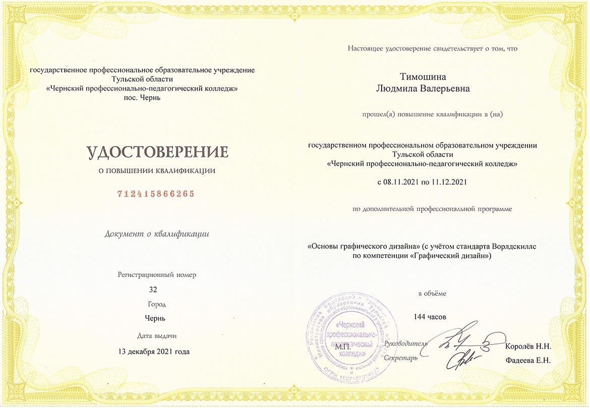 - 13.12.2021 – государственное профессиональное образовательное учреждение Тульской области «Чернский профессионально-педагогический колледж», срок обучения: 08.11.2021-11.12.2021 гг., удостоверение о повышении квалификации по дополнительной профессиональной программе (программе повышения квалификации) по теме: «Основы графического дизайна (с учётом стандарта Ворлдскиллс «Графический дизайн»)», 144 ч., уд. №712415866265