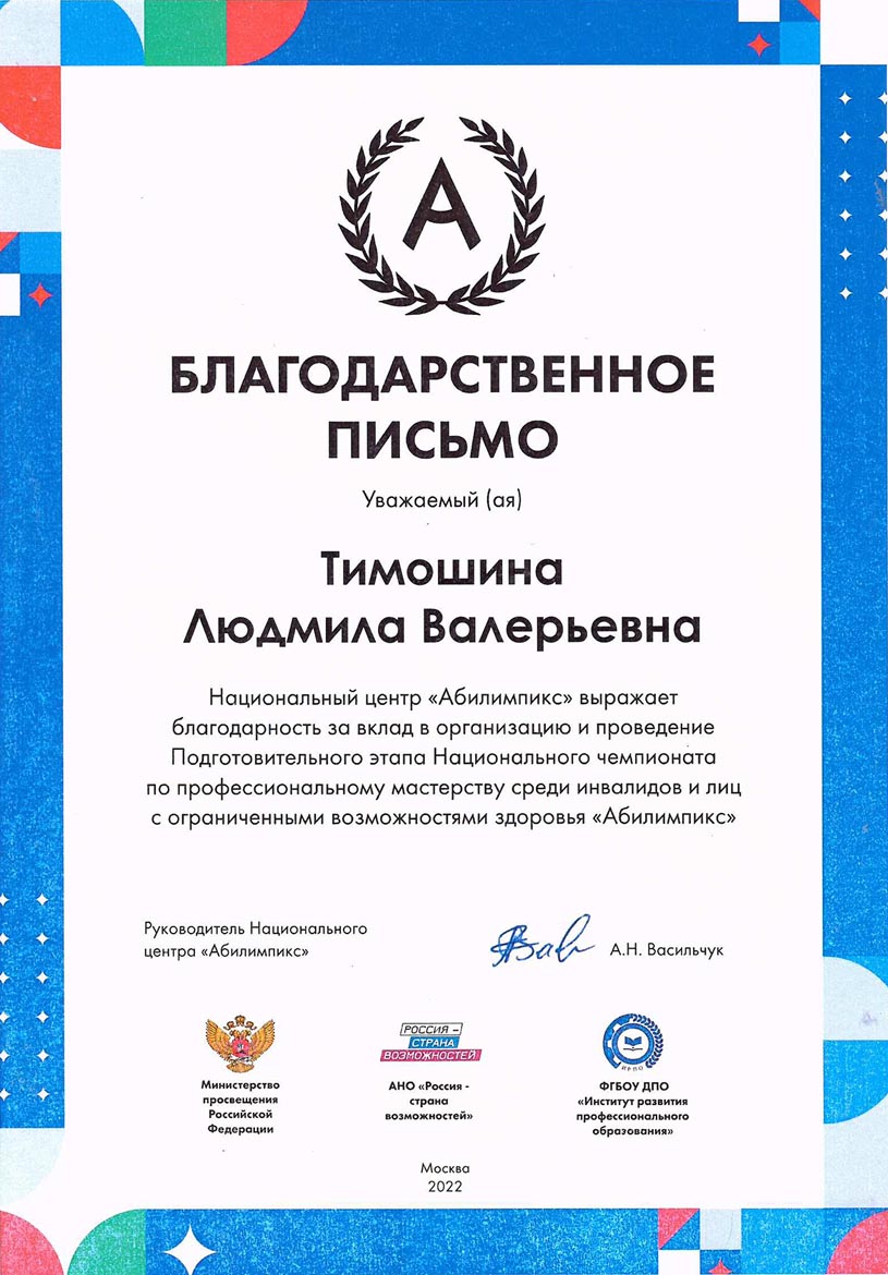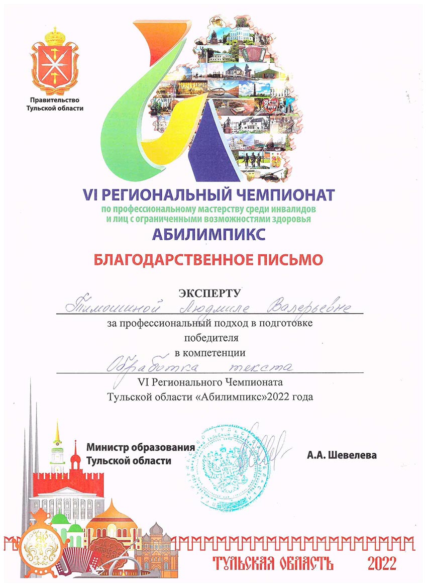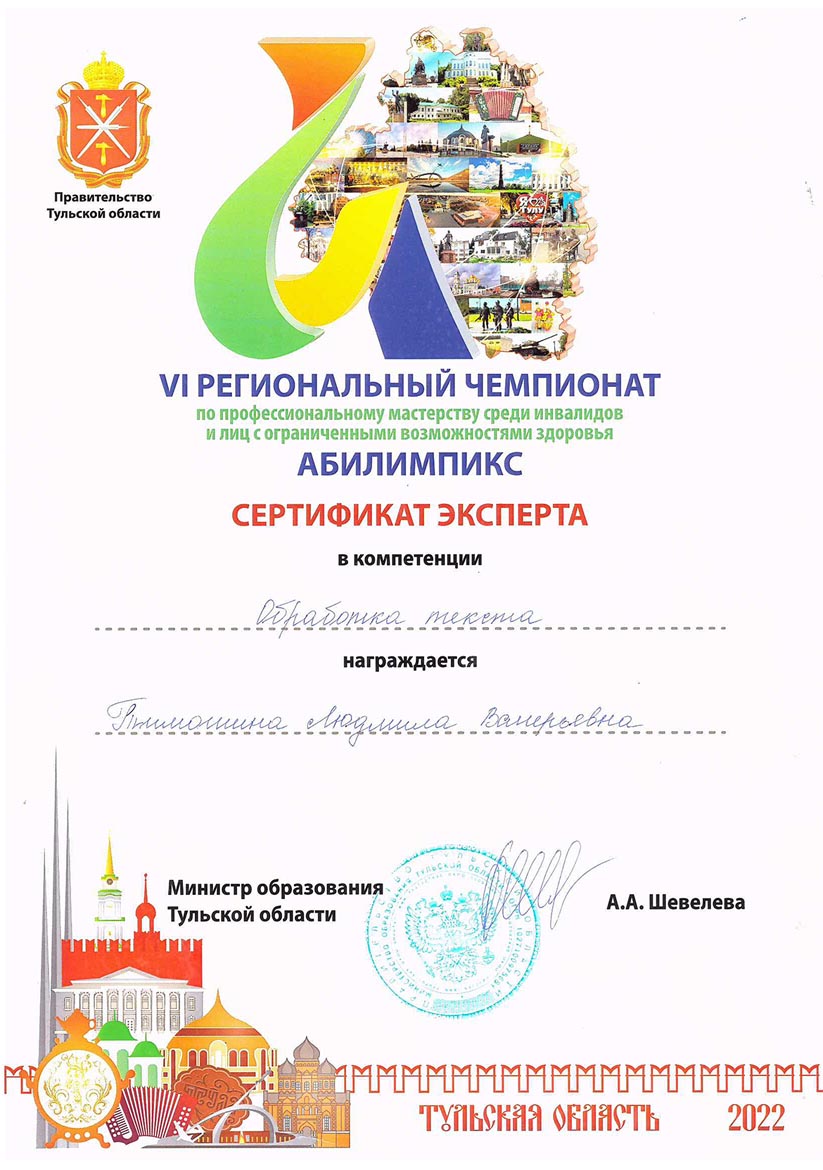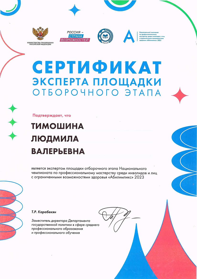 - 27.06.2022 – государственное профессиональное образовательное учреждение Тульской области «Тульский техникум социальных технологий», срок обучения с 30.05.2022 по 27.06.2022 г., удостоверение о повышение квалификации по дополнительной профессиональной программе (программе повышения квалификации) по теме «Подготовка региональных экспертов конкурсов профессионального мастерства «Абилимпикс», 72 ч., уд. № 180001882251