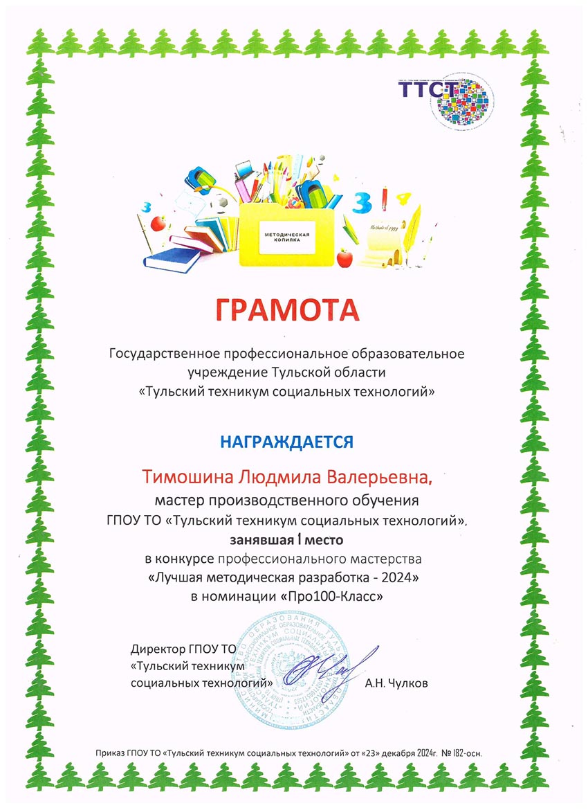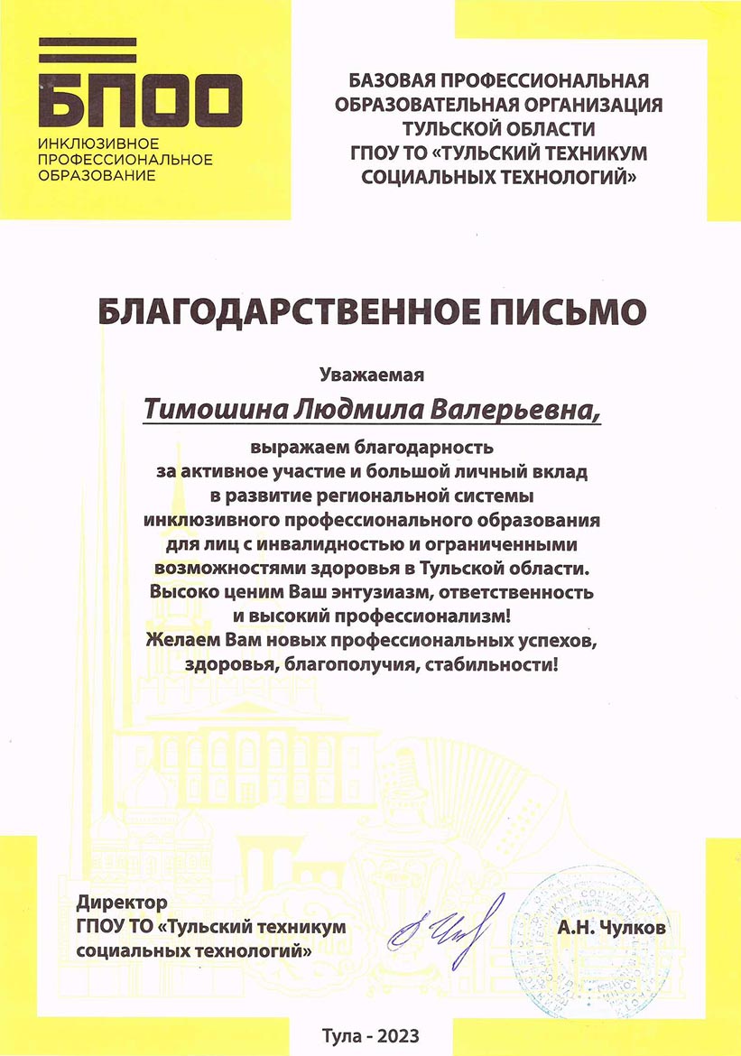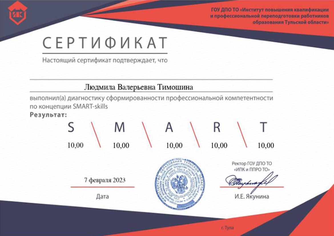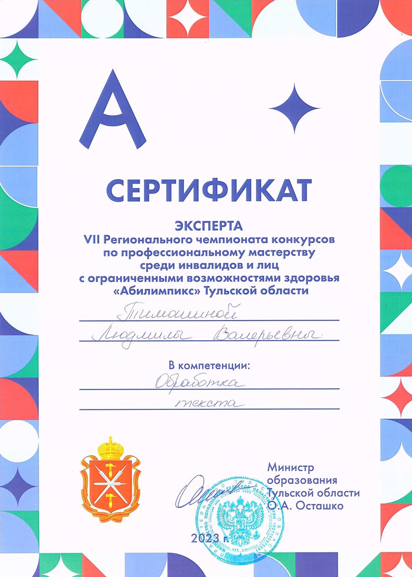 - 15.05.2023 – государственное образовательное учреждение дополнительного профессионального образования Тульской области «Институт повышения квалификации и профессиональной переподготовки работников образования Тульской области» с 17.01.2023 по 27.04.2023 г., удостоверение о повышение квалификации по дополнительной профессиональной программе (программе повышения квалификации) по теме «Актуальные проблемы инклюзивного профессионального образования», 72 ч, уд. № 713103429352