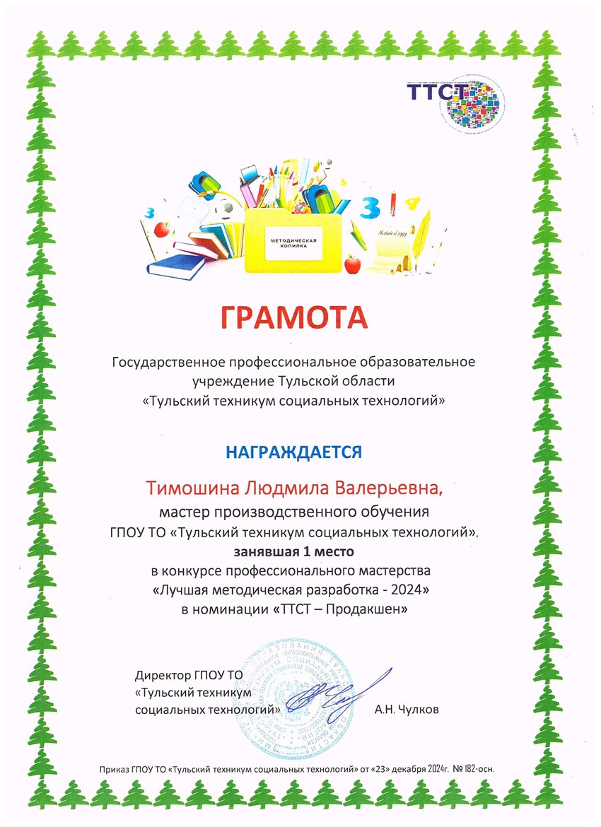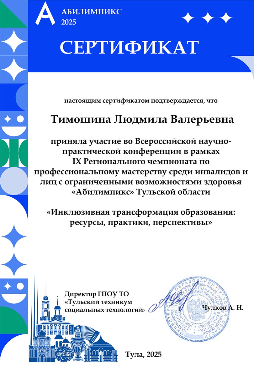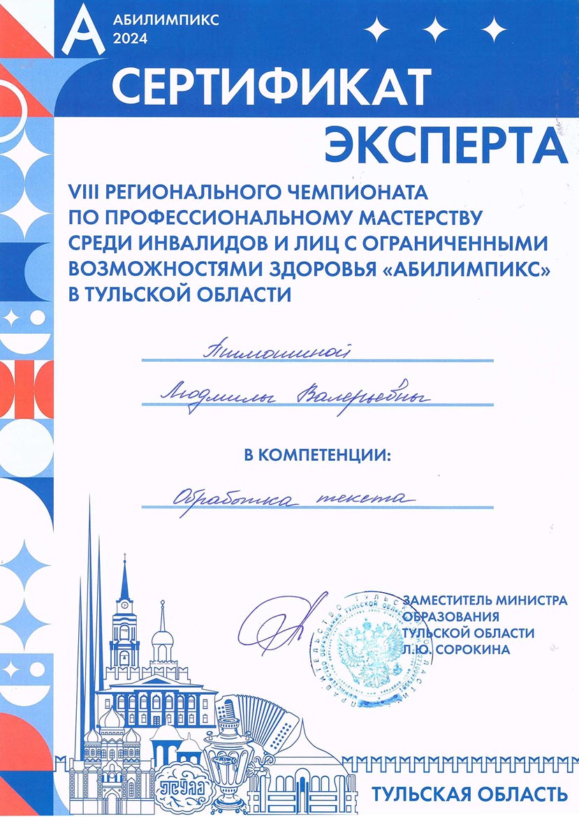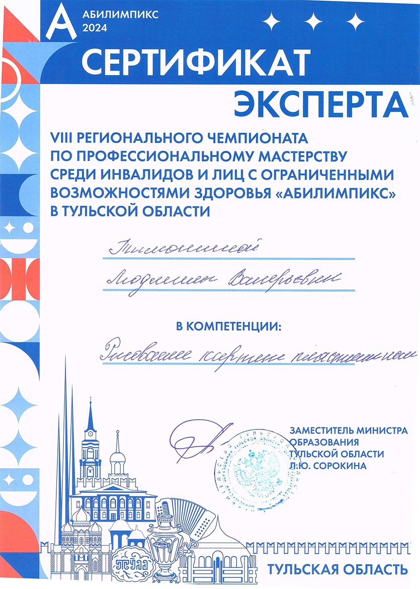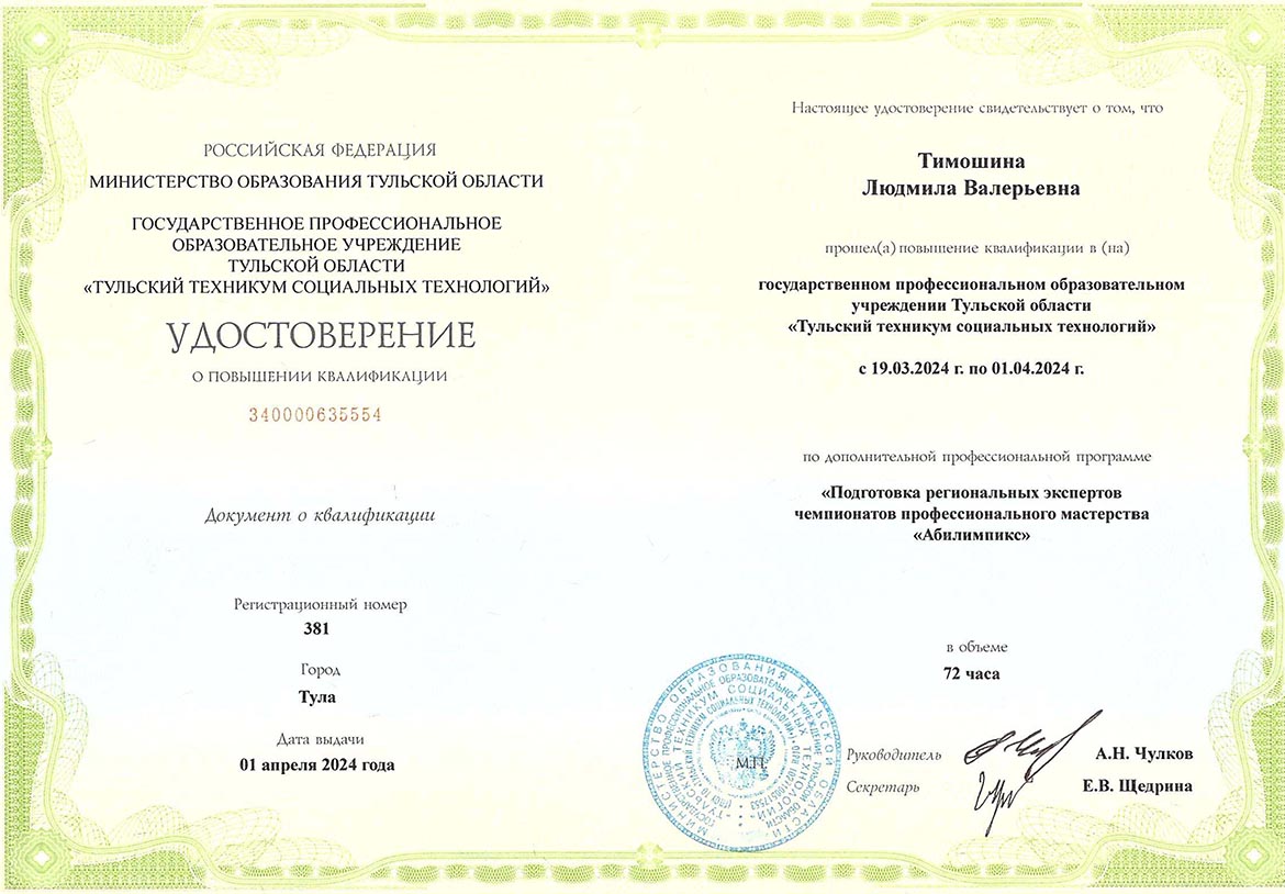 - 01.04.2024 – государственное профессиональное образовательное учреждение Тульской области «Тульский техникум социальных технологий», срок обучения с 19.03.2024 по 01.04.2024 г., удостоверение о повышение квалификации по дополнительной профессиональной программе (программе повышения квалификации) по теме «Подготовка региональных экспертов конкурсов профессионального мастерства «Абилимпикс», 72 ч., уд. № 340000635554
