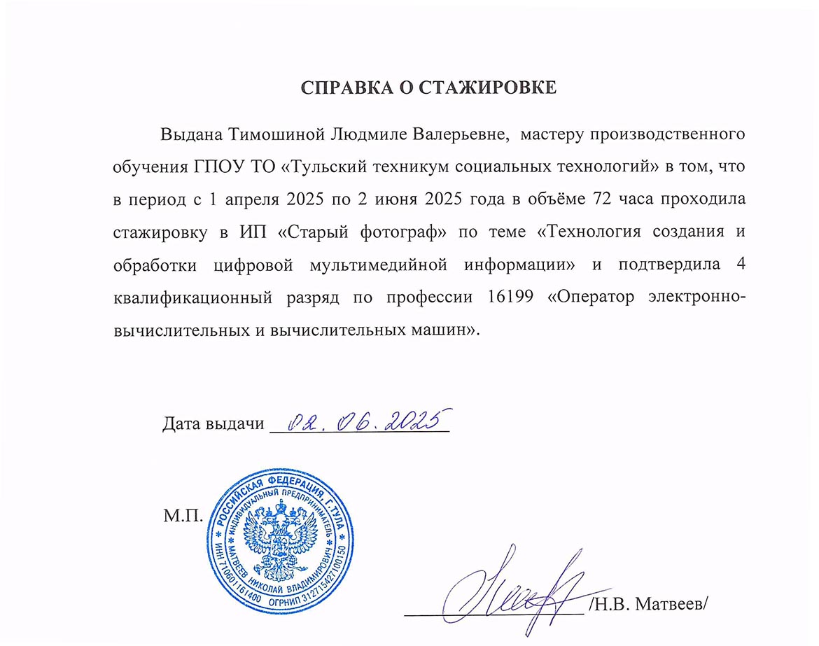 - 02.06.2025 справка о стажировке ИП «Старый фотограф», срок обучения с 01.04.2025 по 02.06.2025, по теме «Технология создания и обработки цифровой мультимедийной информации», по профессии 16199.Оператор электронно-вычислительных и вычислительных машин, 72 ч.