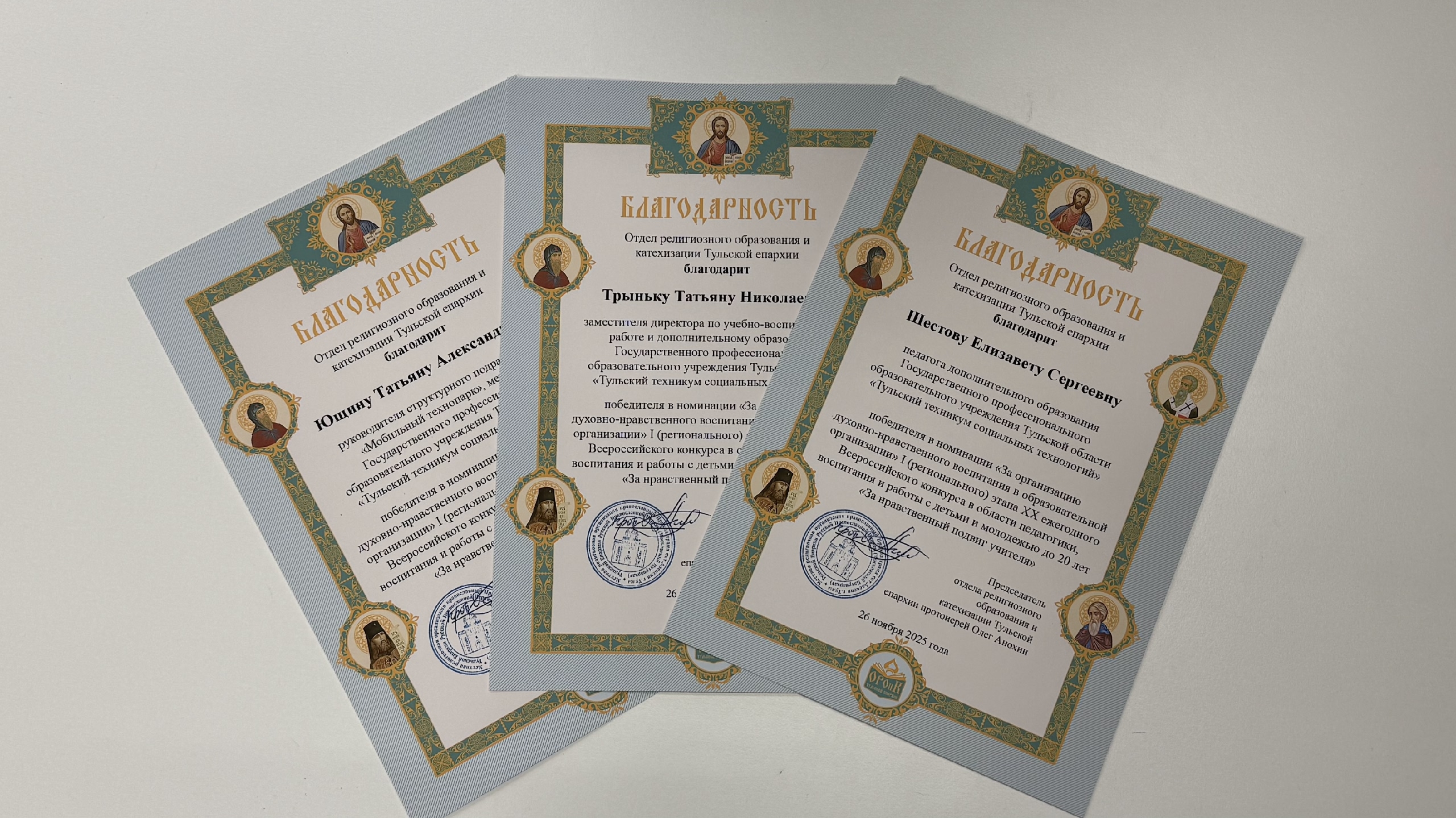На мероприятии Ющина Т.А., руководитель структурного подразделения “Мобильный технопарк”, Трынька Т.Н., заместитель директора по УВРиДО, Шестова Е.С., педагог дополнительного образования победители I (регионального) этапа XX ежегодного Всероссийского конкурса в области педагогики, воспитания и работы с детьми и молодежью до 20 лет «За нравственный подвиг учителя» были награждены Дипломом 1 степени министерства образования Тульской области, Благодарностями отдела религиозного образования и катехизации Тульской и Белевской епархии.